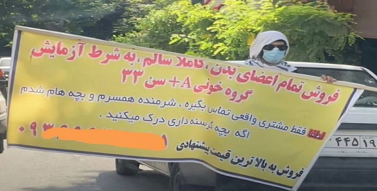 بسبب من الاوضاع المعيشية بالغة الصعوبة نتيجة لسياسات النظام فقد أصبح بيع أجزاء الجسم في إيران، بما في ذلك بيع العيون والكلى والكبد وحتى نخاع العظام وما إلى ذلك، أمرا طبيعيا جدا ويوميا، بحيث توجد كل يوم إعلانات مختلفة لبيع أجزاء الجسم على الجدران والأبواب في طهران ومدن أخرى وهي ظاهرة والآن تمت إضافة الإعلان عبر الفضاء الافتراضي إلى هذا الموضوع. وقد وصل الامر برجل إيراني يبلغ من العمر 33 عاما بنشر إعلان ببيع کافة أعضاء جسده من أجل توفير الطعام لأطفاله، حيث کتب هذا الرجل على لافتة إعلان البيع:” أشعر بالخجل من زوجتي وأولادي، إذا كان لديك أطفال جائعون، فستفهم عملي”!
