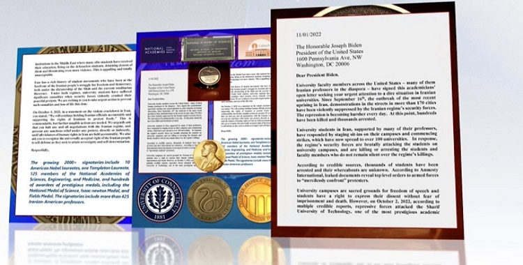 أرسل 2300 أستاذ رفيع المستوى في الجامعات الأمريكية رسالة إلى الرئيس الأمريكي، يوم الأربعاء، 2 نوفمبر 2022، أدانوا لهجمات قوات حرس نظام الملالي على الجامعات الإيرانية؛ مطالبين بالاعتراف رسميًا بحق الشعب الإيراني المشروع والكامل في الدفاع عن النفس.