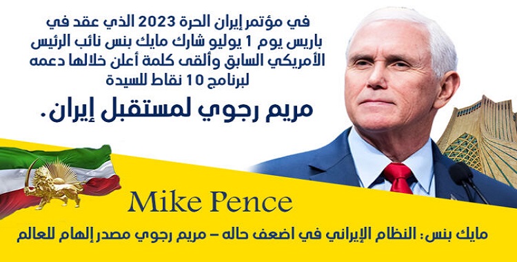 شارك مايك بنس نائب الرئيس الأمريكي السابق في مؤتمر إيران الحرة 2023 الذي عقد في باريس يوم 1 يوليو وألقى كلمة أعلن خلالها دعمه لبرنامج 10 نقاط للسيدة مريم رجوي لمستقبل إيران. و في إشارة إلى وضع نظام الملالي قال: النظام لم يكن أبدًا ضعيفًا كما هو عليه اليوم، وخاطب السيدة مريم رجوي وقال: شكرا لك مريم رجوي على قيادتك المتميزة وشجاعتك الشخصية أنت مصدر إلهام للعالم.