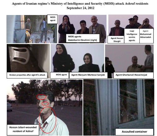 ظهر يوم الاثنين 24 إيلول / سبتمبر 2012, تم إرسال 9 من العناصر التابعة لمخابرات الملالي ولقوة قدس الإرهابية والمأجورين لنظام الملالي في بغداد, إلى أشرف بهدف معاونة القوات العراقية للقيام باستفزاز السكان والإعتداء عليهم بالضرب. ان هولاء العناصر هم كل من ”محمد كريم فنودي” و” محمد أكبرزاده”, ” عبدالكريم ابراهيمي”, قربان علي حسين نجاد”, ”حسن شرقي” و ”مريم مرتضايي سنجابي”.