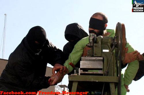 في جريمة بربرية ولاانسانية قام نظام الملالي المعادي للاانسانية يوم الخميس ببتر يد شاب 29 عاماً أمام الملأ في مدينة شيراز بتهمة السرقة. وأفاد تقرير للنيابة العامة في محافظة فارس أن الشاب اضافة الى بتر يده محكوم عليه بالحبس لمدة 3 أعوام والجلد 99 جلدة. كما هناك عدد آخر من السجناء في شيراز حكموا بأحكام مماثلة ببتر اليد والحبس والجلد.