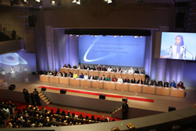 وفي كلمة ألقتها أمام المؤتمر قالت السيدة مريم رجوي رئيسة الجمهورية المنتخبة من قبل المقاومة الإيرانية: أهنئ جمعيكم وجميع اخواتي في إيران وفي السجون الإيرانية وفي كل ارجاء العالم لمناسبة عيد المرأة العالمي وكذلك أهنئ ألف امرأة باسلة في ليبرتي وأشرف. باعتباري مناضلة لقضية المساواة اثمن هذا اليوم التاريخي وآفاقه الرائعة وأحيي نضال وتضحيات النساء في انحاء العالم. في حين قلبي مفعم بالحزن والغضب من انه وبعد مضي قرن من اعلان اليوم العالمي للمرأة مازال نشاهد هيمنة العنف والاغتصاب والقتل ورش التيزاب والتعذيب والتمييز والاستغلال على حياة ومصير المرأة في القسم الأعظم من العالم والحزن والغضب من عدم المساواة والاستخفاف ما يعاني منه المرأة حتى في أكثر البلدان تقدما. اني اتحدث عن حركة كان تحظى بعلاقات أكثر تقدما بين المرأة والرجل في الثمانينات القرن الماضي، وبالرغم من ذلك وبالرغم دورها الناشط في المقاومة الا انه كان المرأة بعيدة جدا عن المساواة الكاملة وقيادة الحركة. وكان هذه الثورة لسد هذا الفراغ وتحرير الطاقات الإنسانية. واستنتج مجاهدي خلق فيما بعد انه اذا كانوا يريدون معارضة الاستبداد الديني فعليهم ان يتحركوا ضد النظام الرجولي والرجعي أي ايديولوجية الجنسية. ان الثورة العقائدية تنبع من رؤية مجاهدي خلق من الانسان ما يتناقض من رؤية خميني الرجعية تماماً.