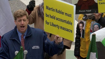 واعرب المتظاهرون عن احتجاجهم على تصرفات مارتن كوبلر الممثل الخاص للامين العام للامم المتحده في العراق واسلوب عمله، وأكدوا ان ممثل الامين العام في العراق هو من ارسل سكان اشرف الى سجن ليبرتي خلافا لرغباتهم بعد ان قدم لهم وعودا بالامن والسلامه وباعادة التوطين السريع وبتوفر المعايير الانسانيه في المعسكر، واشاروا الى ان كوبلر قام بتشريد سكان اشرف عامدا متعمدا في اطار هدف ساسيي محدد، ولإرضاء النظام الايراني والحكومة العراقيه الأمر الذي اسفر حتى الآن عن ازهاق ارواح 12 شخصا، وشددوا على ان كوبلر ينبغي ان يمثل للمساءله امام مرجعية عادلة وغير منحازه على ما تسبب به من كارثة انسانية.