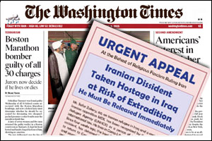 ثم تتطرق صحيفة واشنطن تايمز إلى المجلس الوطني للمقاومة الإيرانية مقدمة إياه تحالفا شاملا يضم منظمات ومجموعات وشخصيات ديمقراطية في المعارضة الإيرانية، تم تأسيسه عام 1981 في طهران بمبادرة من جانب زعيم المقاومة الإيرانية السيد مسعود رجوي
