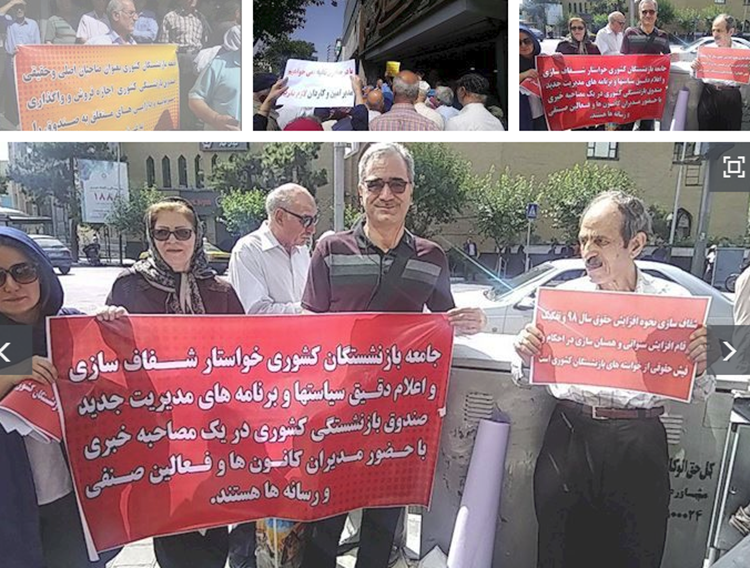 احتشدت مجموعة من المتقاعدين المدنيين في طهران صباح يوم الاثنين ، 10 يونيو، أمام صندوق المعاشات التقاعدية في شارع فاطمي بطهران، احتجاجًا على عدم دفع مطالباتهم. ورفع المحتجون لافتة كتب عليها: شريحة المتقاعدين في البلاد باعتبارهم الآصحاب الحقيقيين لصندوق المعاشات التقاعدية للبلد لا يسمحون لأي شخص ببيع وتحويل الأموال والأصول العائدة للصندوق.