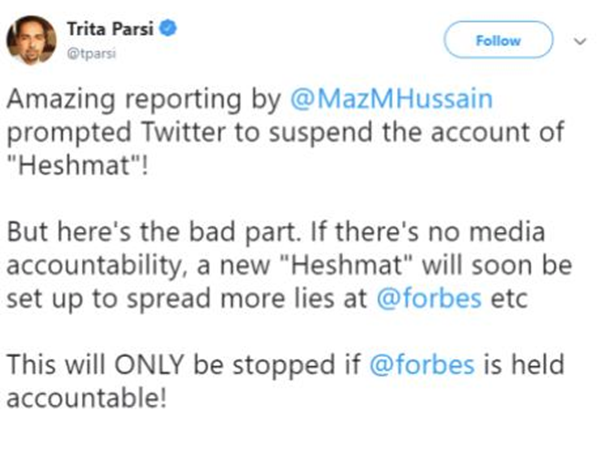 وبذلك خلال أسبوعين، أغلقت Twitter أكثر من 7500 حساب مرتبط بالنظام الإيراني. شاركت بعض هذه الحسابات في الحملة ضدي ومعارضين آخرين لنظام الملالي.