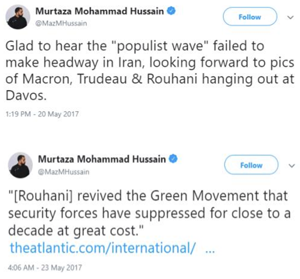 مرتضى حسين هو أيضا نشط جدا في الترويج لحجج النظام الإيراني على تويتر. وهو يصف على وجه التحديد رئيس النظام الإيراني، حسن روحاني، كرجل معتدل.
