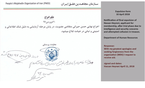 يكشف تحقيق بسيط في الوثائق أن مقالة اينترسبت تصف حسن حيراني كمسؤول رفيع المستوى منشق من مجاهدي خلق، فيما هو بالفعل أحد المتقدمين للعضوية، والذي تم طرده في 10 أبريل 2018 بسبب «الشكوك به لأسباب أمنية واستخباراتية».