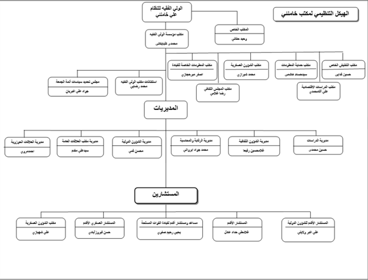 وتجدر الإشارة إلى أن كل مسئول في مكتب خامنئي لديه خبرة كبيرة في القمع والإرهاب، ولهذا السبب تم تعيينهم في هذا المكتب لرسم السياسات واتخاذ القرار، وأغلبهم لديهم سجل مفضوح من الجرائم والاغتيالات أثناء عملهم في حرس الملالي وجهاز المخابرات وغيرها من الأجهزة القمعية في النظام. (إن الهيكل التنظيمي لمكتب خامنئي وأجهزته الرئيسة مدرجة أدناه).