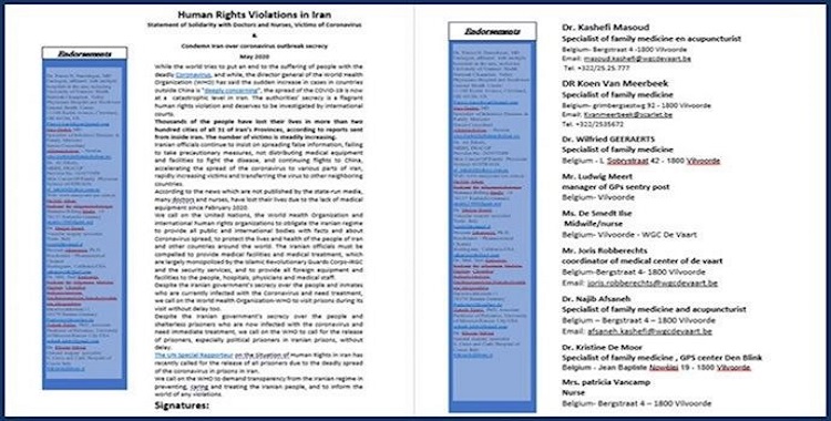 أكثر من 300 طبيب إيطالي وبلجيكي؛ من رابطة المديرين الطبيين في محافظة تورينو، الإيطالية، ومجلس المجمع الطبي لمدينة كونئو، ونقابة الأطباء في محافظة بيه مونته؛ و مجموعة من الأطباء والموظفين الطبيين في بيرغام، بالإضافة إلى مجموعة من الأطباء البلجيكيين أدانوا في بيانات ورسائل منفصلة الأنشطة الإجرامية والإجراءات الخادعة لنظام الملالي في كارثة كورونا.